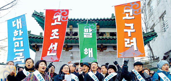 "고구려가 중국이면 중국은 몽골족이냐!" 소설가들이 중국의 고구려사 왜곡에 항의하며 14일 서울 명동 옛 중국대사관 앞에서 시위를 벌이고 있다. 한편 정부는 국정현안정책조정회의에서 학계의 고구려사 연구를 적극 지원키로 했다.