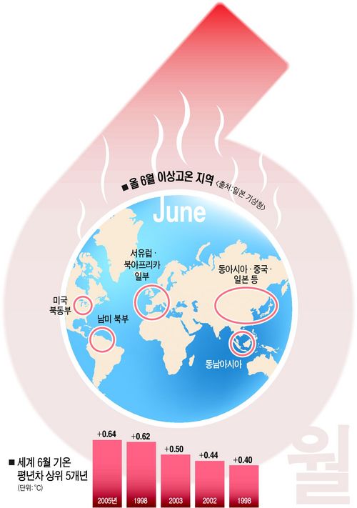 ◆ 지구온난화 가속화가 원인=지난 100년간 6월 평균기온은 0.6도 상승하는 데 그쳤다. 그러나 지난 수년간 상황은 달라졌다. 일본