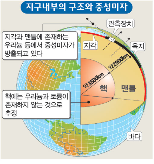 일본 도호쿠대학과 미국,중국,프랑스 학자 87명으로 이뤄진 4개국 공동연구진은 지구 내부의 우라늄 핵 분열시 나오는 지구뉴트리노를