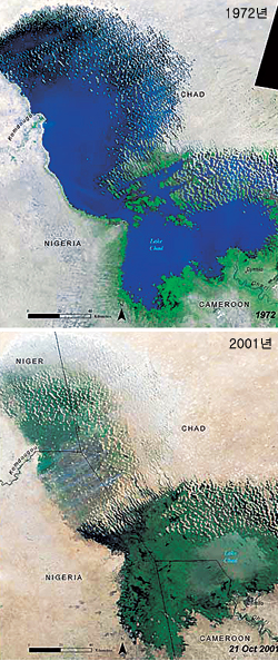 자랑하던 차드 호는 2001년 촬영된 사진에서는 대부분의 수역이 사라지고 본디 호수가 있던 자리의 동남부에 치우친 자그마한 곳만 남아 있다.