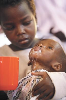 영양 실조에 걸린 시몬을 돌보는 건 열살 된 언니 이마미 샤론이다. 언니는 왼팔에 아기 머리를 받친 뒤 우유를 먹였다. 젖병은 없다.
